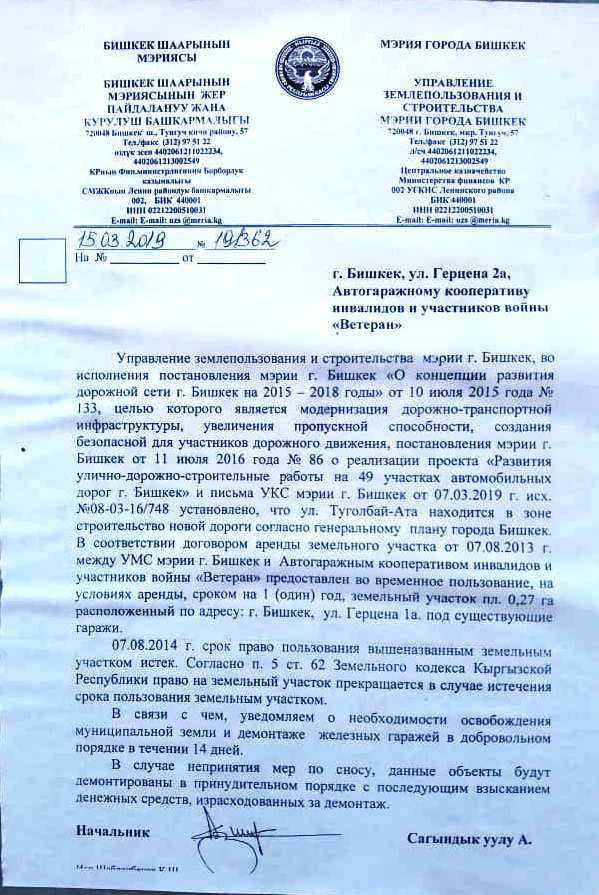 В Бишкеке для строительства улицы Туголбая Аты снесут гаражи кооператива инвалидов и участников Великой Отечественной войны «Ветеран». Об этом в социальной сети Facebook написала пользователь Ольга Кадырова.