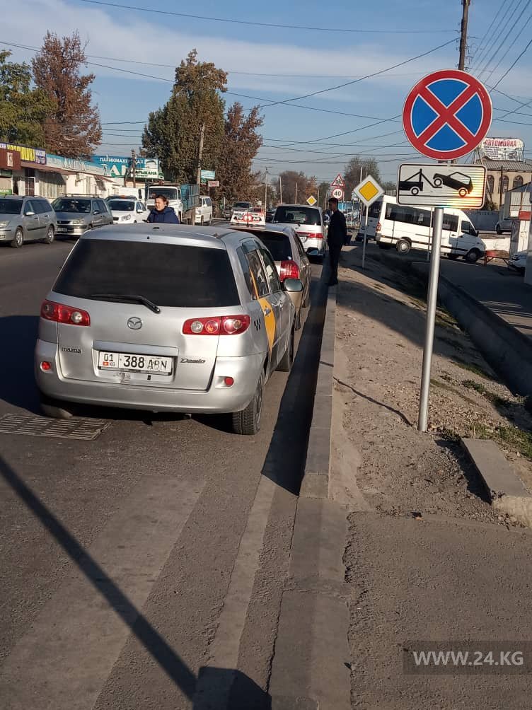 Таксист занял полосу движения, встав под знаком «Работает эвакуатор». Как сообщил автор фото, у этого водителя, согласно сервису Carcheck, штрафы на 24,5 тысячи сомов.