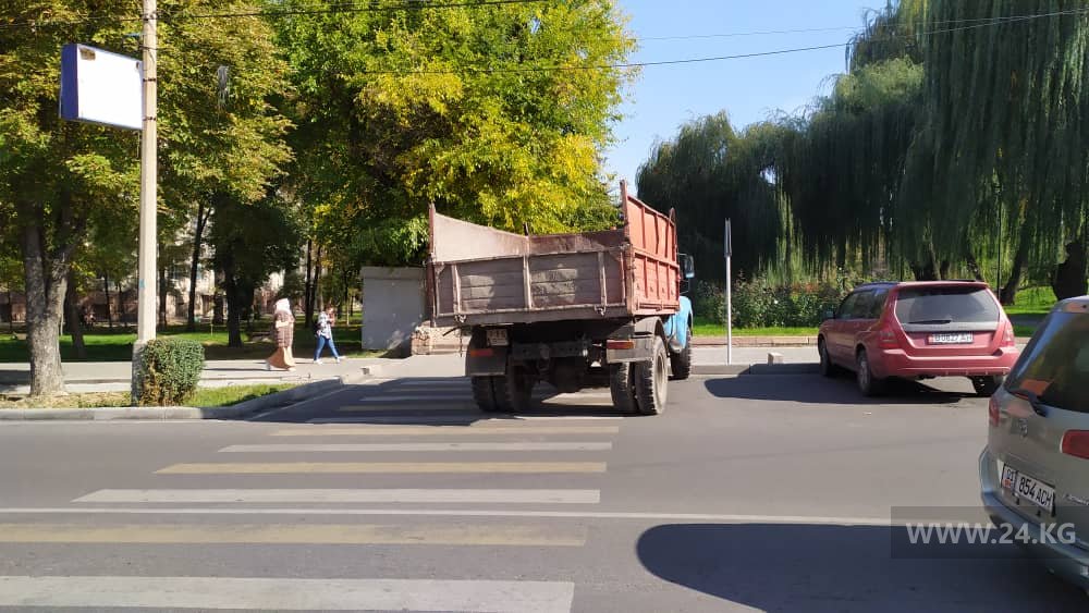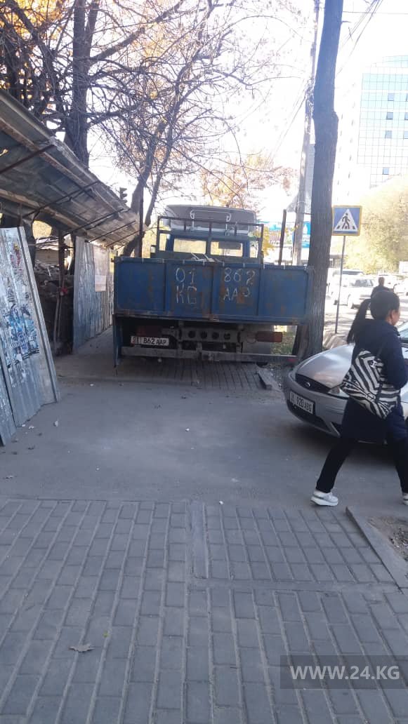 На пешеходке возле драмтеатра на улице Тыныстанова припарковалась и грузовая машина.