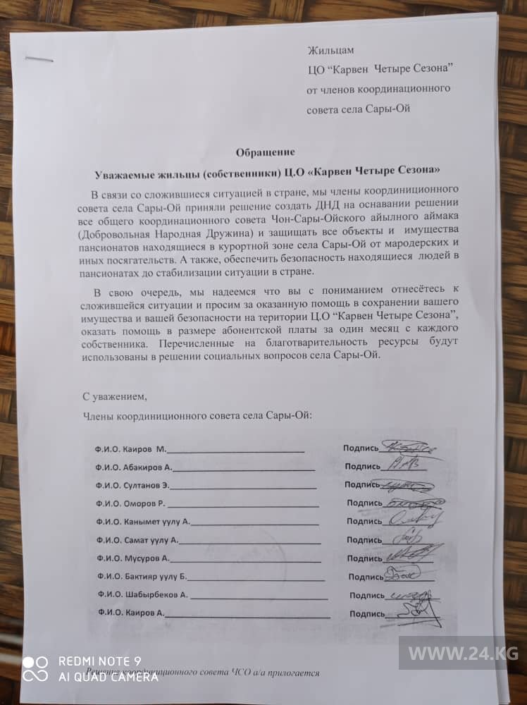 По их данным, администрации центра отдыха пришло письмо от так называемого координационного совета села Сары-Ой. В нем говорится, что решено создать добровольные народные дружины для охраны объектов и имущества в курортной зоне до стабилизации ситуации в стране.