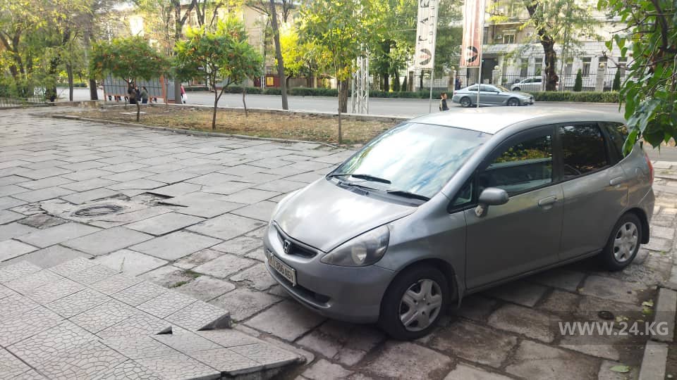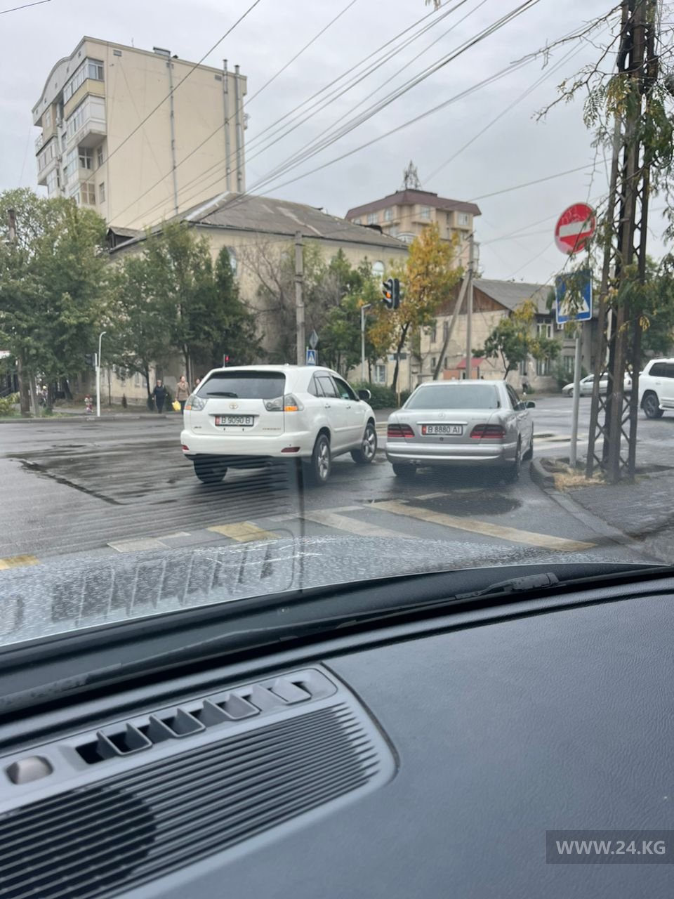 На пересечении улиц Боконбаева и Тыныстанова машину оставили прямо на перекрестке. Собирался ли водитель «Тойоты» ехать дальше или тоже хотел припарковаться рядом, неизвестно.