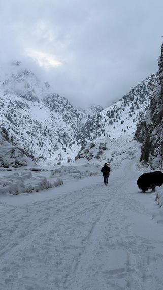 Выбираемся из города. Если в Бишкеке снегом и не пахнет, то в предгорьях его предостаточно. Свои фотографии Диляра Альмеева сделала уже в этом году выше природного парка «Ала-Арча» в стороне горнолыжной базы «Кашка-Суу».