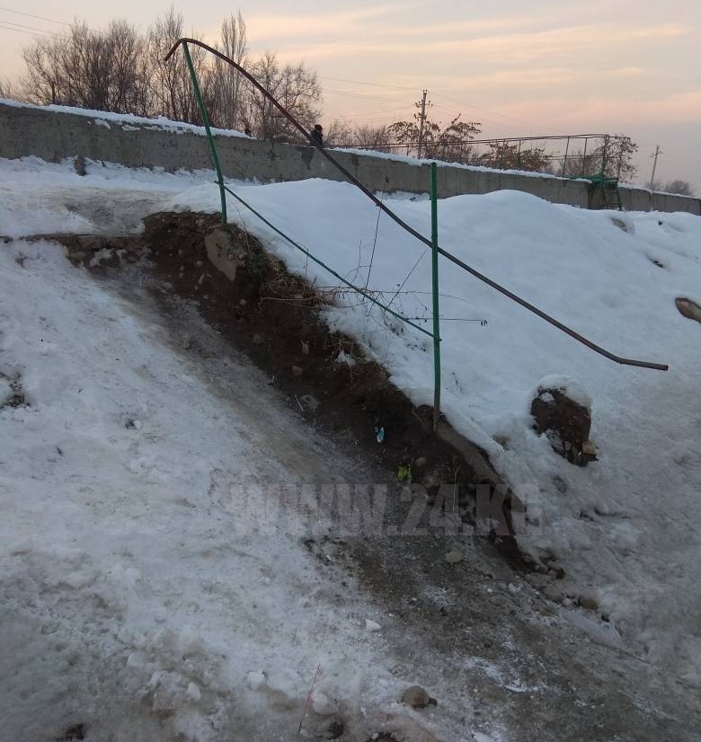 «После ремонта дороги эту лестницу подрядчик не восстановил, а просто снес. Теперь приходится скатываться или карабкаться по ледяной горке», — сообщил бишкекчанин.