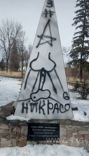 В Караколе вандалы испортили неприличными рисунками монумент героям, погибшим в баткенских событиях. Об этом ИА «24-kg.com» сообщили читатели.
