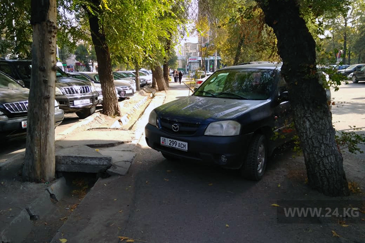 Этот водитель на проспекте Манаса, например, загородил проход. Пешеходам приходится обходить его, чтобы пройти.