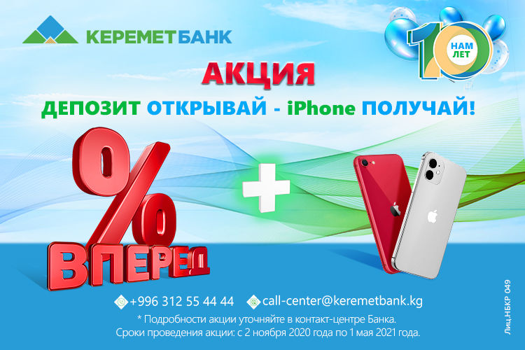 В честь 10-летия «Керемет Банк» запускает праздничную акцию «Депозит открывай — IPhone получай»! Юридические и физические лица, открывшие депозиты в ОАО «Керемет Банк» со 2 ноября 2020 года по 1 мая 2021 года, получают возможность стать обладателями одного из десяти смартфонов самого последнего поколения.