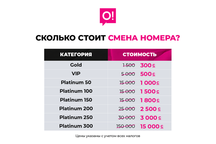 Если вы уже абонент О!, то можете проверить доступность желаемого номера самостоятельно. Для этого необходимо набрать команду *212*новый номер в формате 0ХХХAAAAAA#. Если номер свободен, купить его можно не выходя из дома с помощью услуги «Мой новый номер», главное, чтобы на вашем балансе была достаточная сумма. Стоимость номеров премиальных категорий Gold, VIP и Platinum со скидкой до 90 процентов составит*: