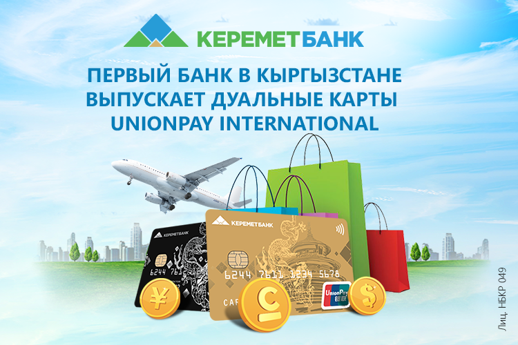 Еще одно преимущество — дуальная карта UnionPay International от «Керемет Банка» мультивалютная, одновременно обслуживаются три валюты: сомы, юани и доллары.