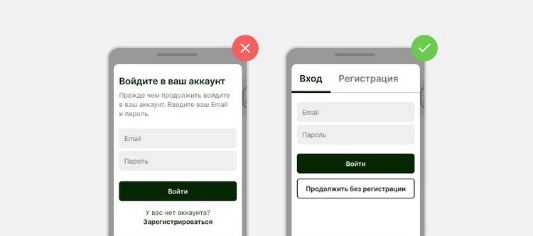 - Обязательная регистрация. Часто требование регистрации при оформлении останавливает пользователей. Есть те, кто не хочет давать компании свои данные, а есть и те, кто попросту не хочет тратить на это свое время.