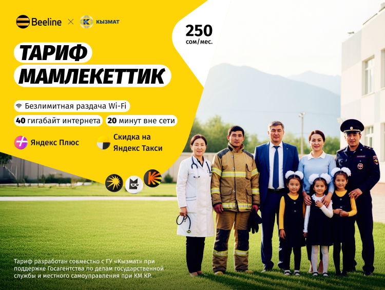 Государственный мобильный оператор Beeline Кыргызстан запустил новый тариф «Мамлекеттик», разработанный при поддержке Госагентства по делам государственной службы и местного самоуправления при кабинете министров КР совместно с ГУ «Кызмат». Тариф создан для государственных и муниципальных служащих — с особым вниманием и безграничным уважением к тем, кто служит народу.