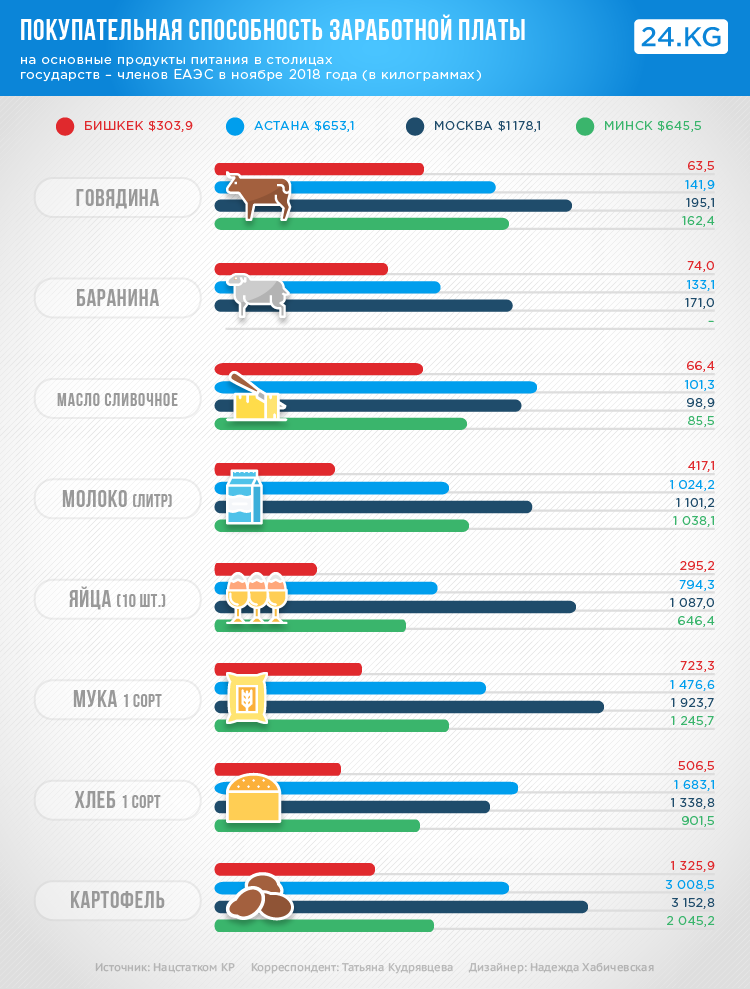 Например, на бишкекскую зарплату можно купить в 2,6 раза меньше продуктов, чем в Москве.