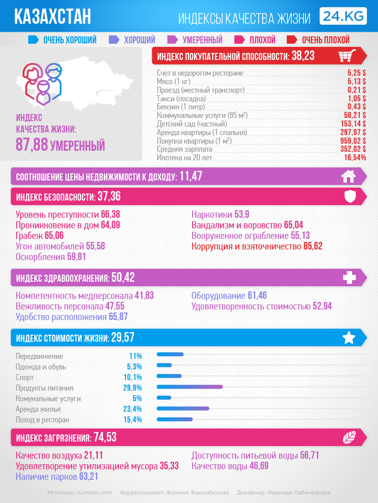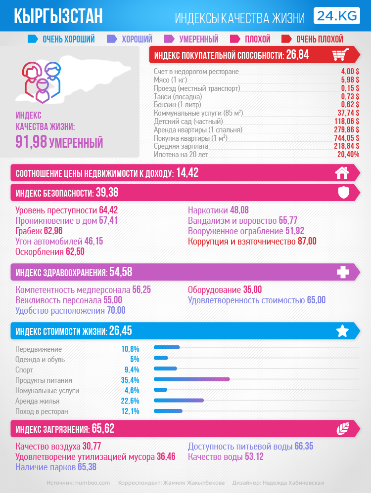 Сервис автоматически сравнивает показатели всех государств с США. В Кыргызстане жизнь на 62,12 процента дешевле, чем в Америке, а арендная плата за жилье ниже на 77,75 процента.