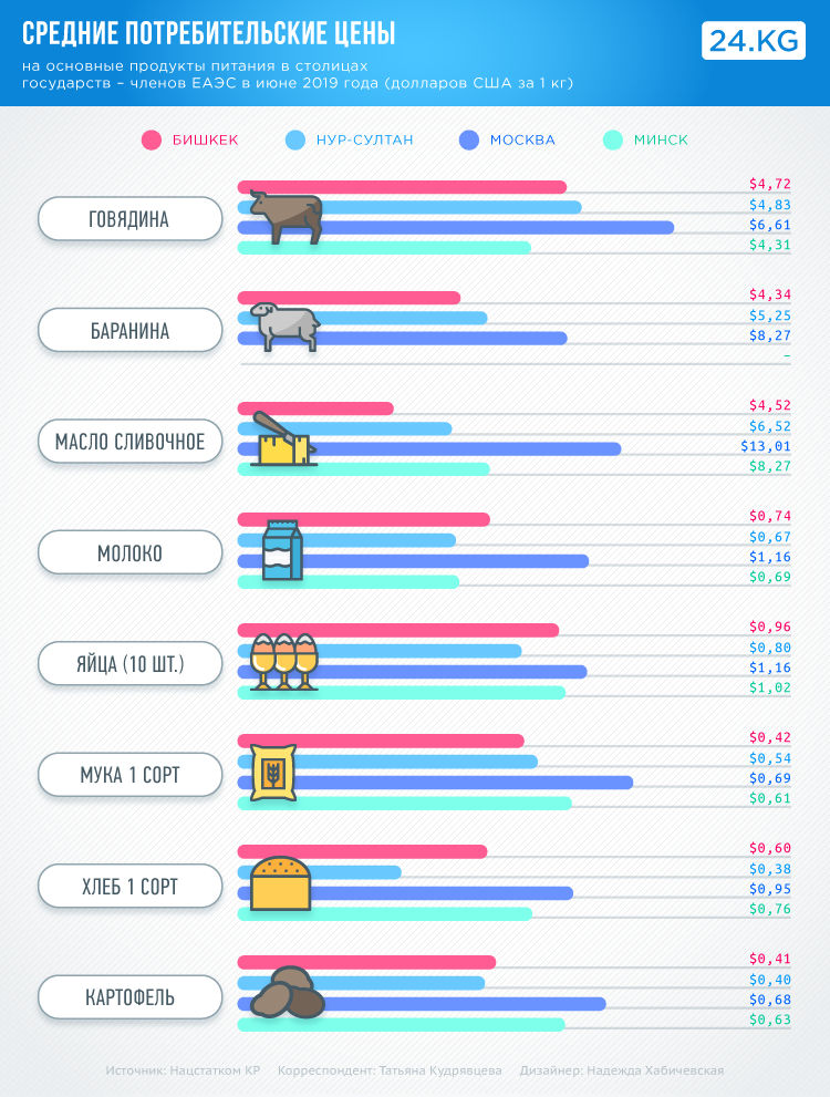 В июне этого года на среднюю зарплату меньше всего продуктов среди столиц стран ЕАЭС можно было купить именно в Бишкеке. Например, в столице Кыргызстана на среднюю зарплату можно приобрести в 3,25 раза продуктов меньше, чем в Москве. Самый большой разрыв отмечается в возможности покупки на зарплату яиц — 4,4 раза, а самый наименьший в покупке сливочного масла — 1,85 раза.