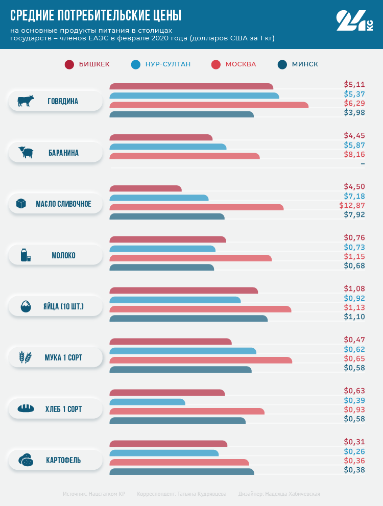 В феврале 2020 года уровень средних розничных цен на пастеризованное молоко по Бишкеку был выше, чем в Нур-Султане на 3,9 процента и Минске — на 10,5 процента. Говядина в столице Беларуси на 22 процента дешевле бишкекской. Цены на хлеб в столице Кыргызстана были на 38,1 процента выше, чем в Нур-Султане и 7,9 процента — в Минске. Средние цены на яйца в Бишкеке были выше, чем в столице Казахстана на 14,8 процента.