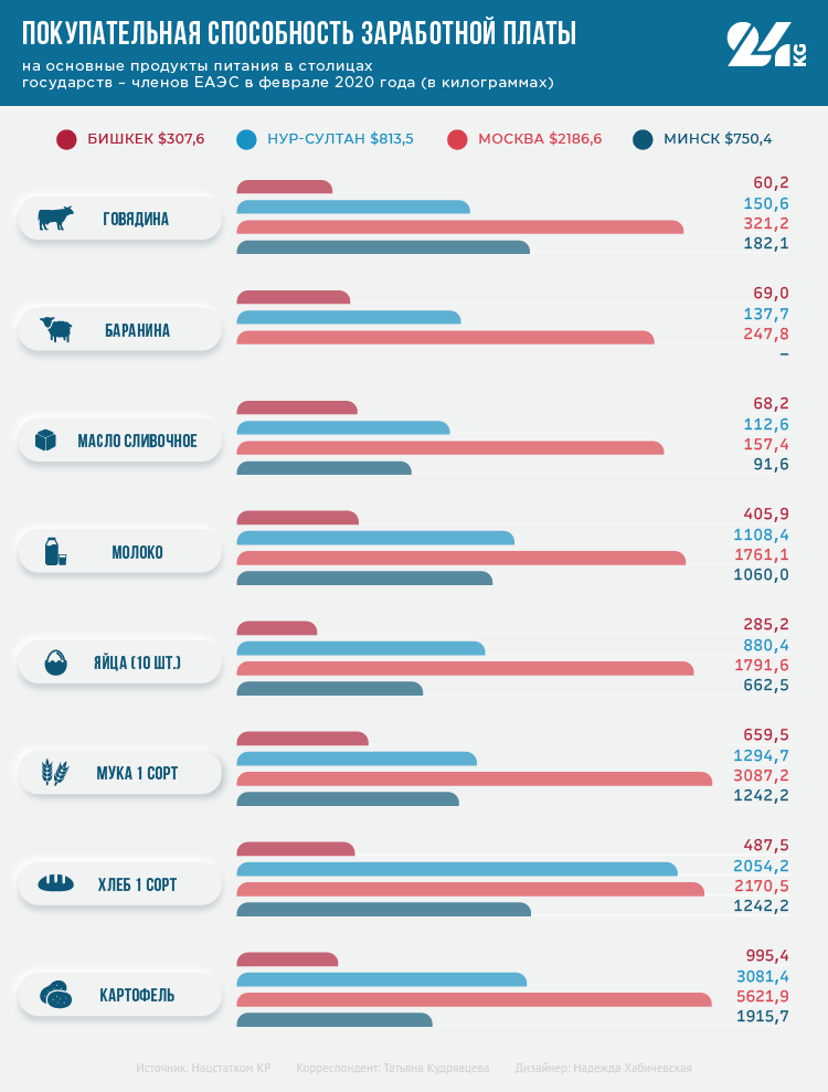 Сравнительный анализ покупательной способности среднемесячной заработной платы показал, что в феврале 2020 года она по продуктам первой необходимости в Бишкеке отставала от столиц стран ЕАЭС. Это связано в первую очередь с низким размером зарплаты в столице Кыргызстана.