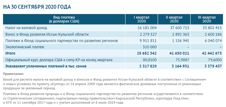 Centerra Gold Inc. («Центерра») и «Кумтор Голд Компани» («Кумтор») подвели итоги работы в третьем квартале 2020 года. За девять месяцев 2020 года на руднике произвели 465 тысяч 734 унции, или 14 тонн 485,95 килограмма золота. С начала года компания перечислила налогов и обязательных платежей на сумму более 10,21 миллиарда сомов.