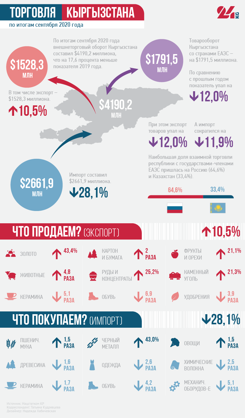 По итогам сентября внешнеторговый оборот Кыргызстана составил $4 миллиарда 190,2 миллиона, что на 17,6 процента меньше показателя 2019-го. Экспорт — $1 миллиард 528,3 миллиона (рост на 10,5 процента), импорт — $2 миллиарда 661,9 миллиона (падение на 28,1 процента).С государствами ЕАЭС Кыргызстан наторговал на $1 миллиард 791,5 миллиона.