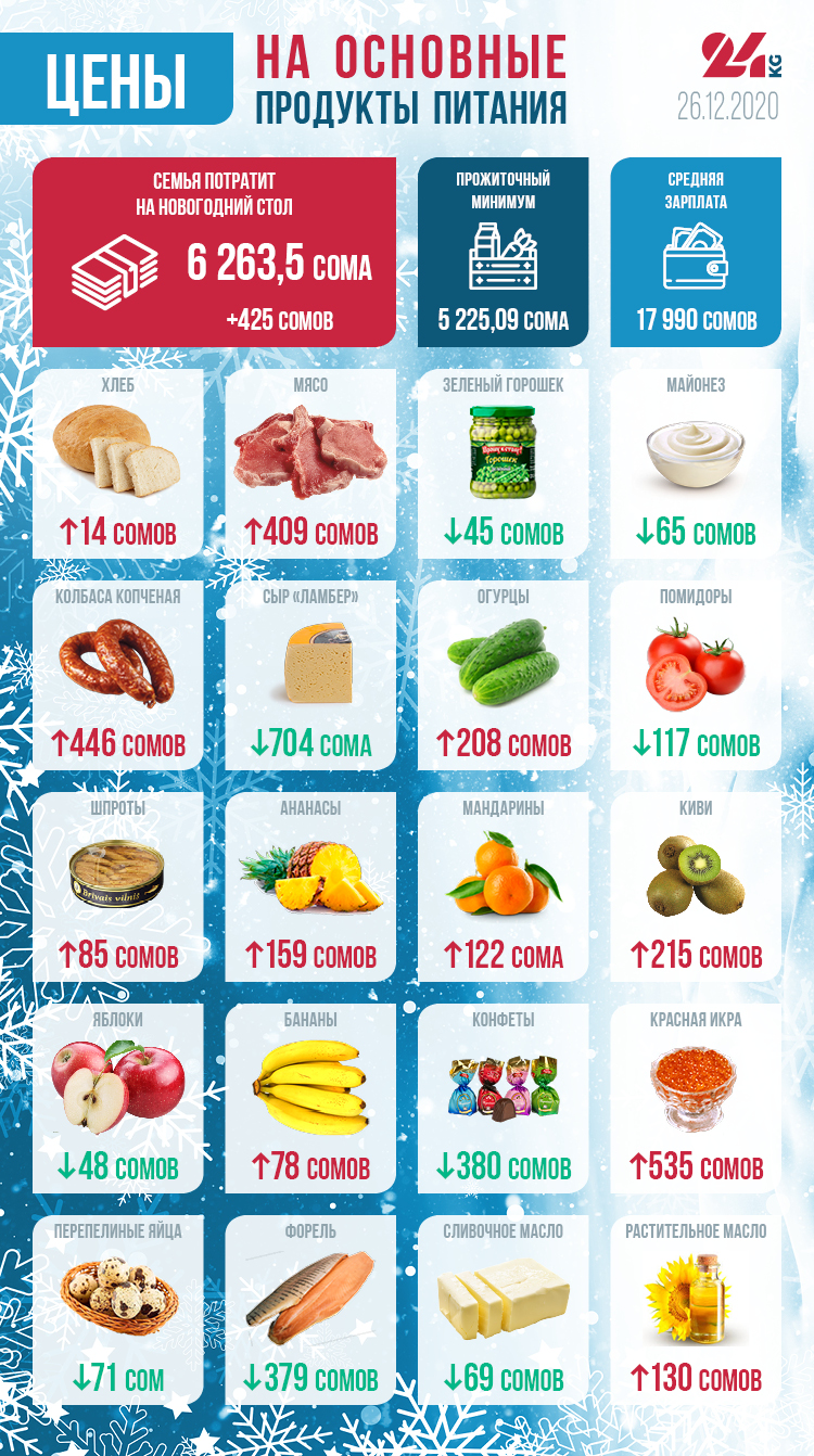 В преддверии Нового года мы решили немного изменить состав нашей корзины. Вместо традиционного набора продуктов наша семья будет накрывать стол к Новому году. 24-kg.com решило высчитать среднюю потребительскую новогоднюю корзину для Бишкека.