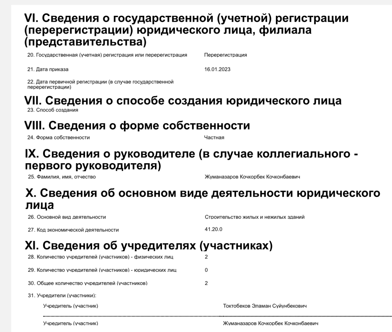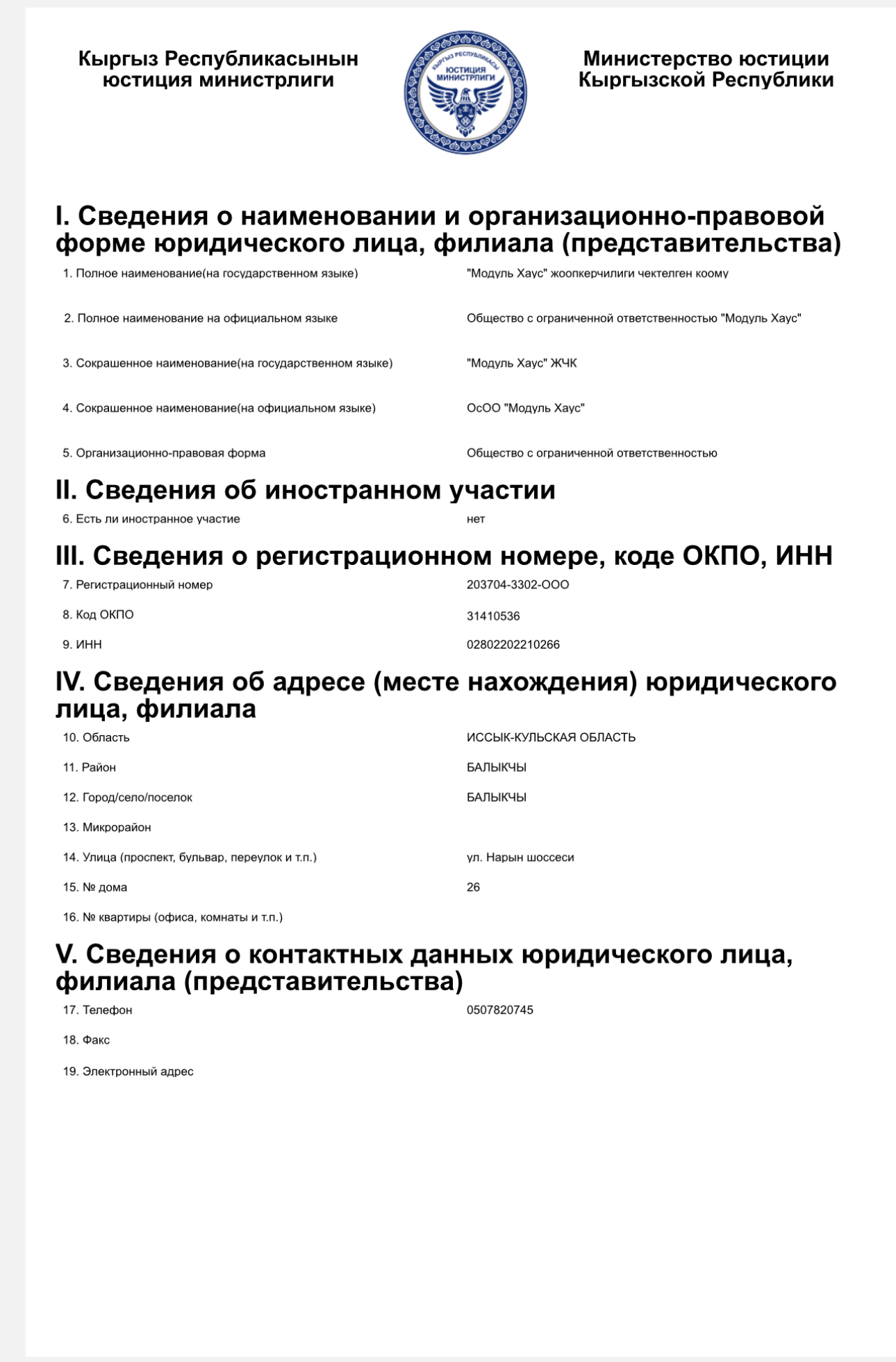 В базе данных Министерства юстиции значится, что Module house создана лишь в феврале прошлого года и прошла перерегистрацию в январе 2023-го. Ее учредителями значатся Кочкорбек Жуманазаров и Эламан Токтобеков, руководителем — Кочкорбек Жуманазаров. В 2022 году компания заплатила налогов в бюджет страны на сумму 235,5 тысячи сомов. В этом году выплаты значительно выросли. За шесть месяцев они составили 8 миллионов 871,2 тысячи сомов.