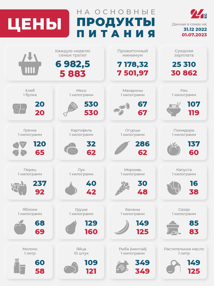 По сравнению с январем — июнем 2022 года стоимость продуктовой корзины снизилась совсем немного — на 100 сомов.