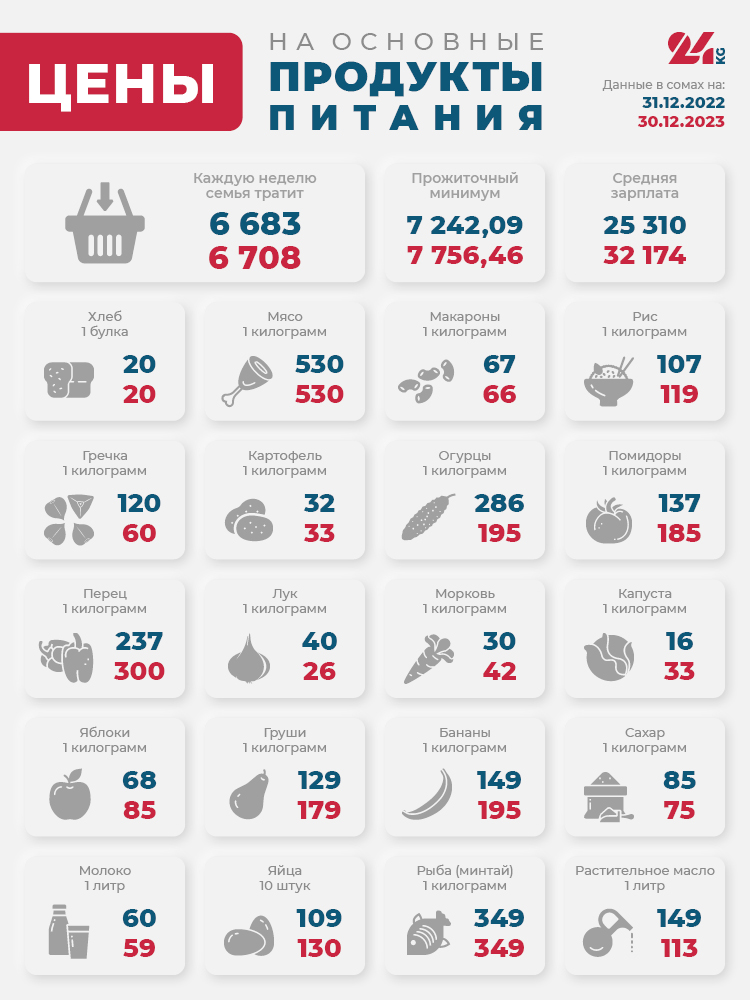 По сравнению с 2022-м цена продуктовой корзины выросла немного — на 25 сомов.