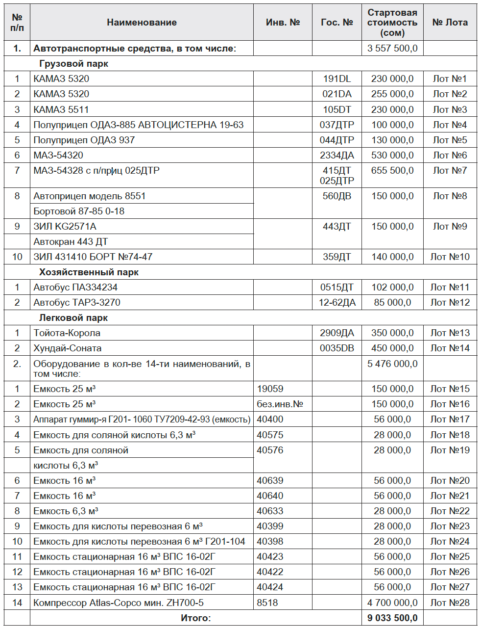 На аукцион выставлено 28 лотов, в том числе грузовые и легковые автомобили, прицепы, автобусы и оборудование химического и промышленного назначения.