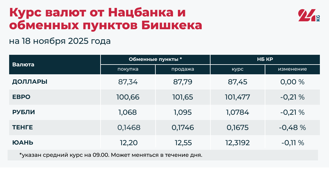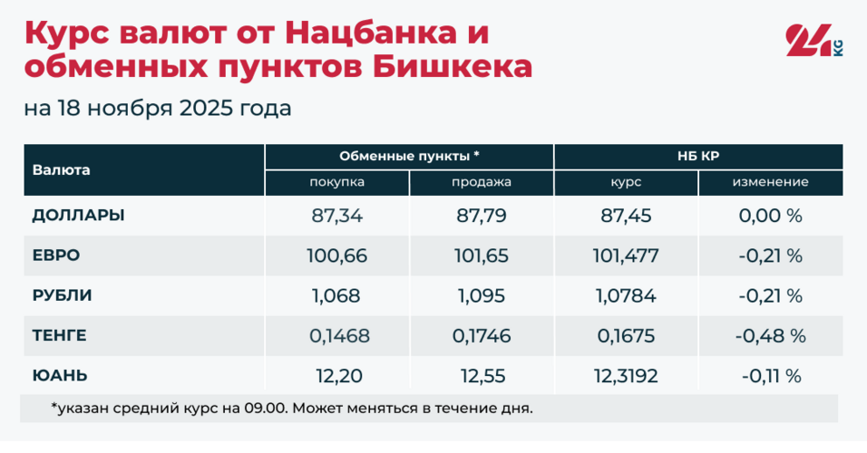 • Средний курс в обменных пунктах: покупка — 87,34 сома, продажа — 87,79 сома.
