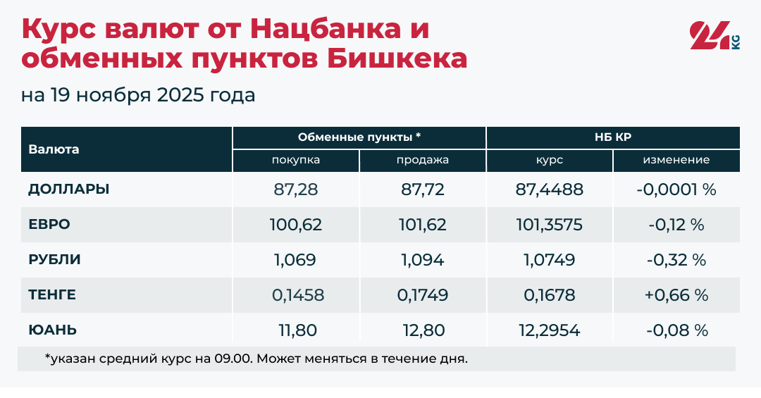 • Средний курс в обменных пунктах: покупка — 100,62 сома, продажа — 101,62 сома.