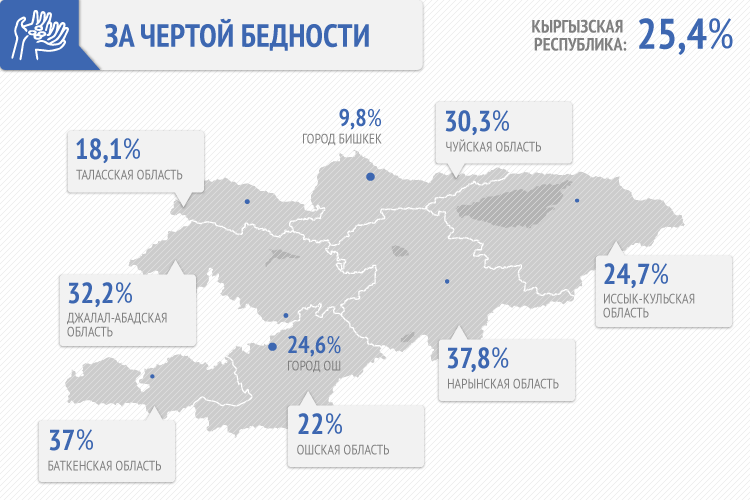 Самый высокий уровень бедности в Нарынской и Баткенской областях — 37,8 и 37 процентов. Немногим лучше ситуация в Джалал-Абадской области — 32,2 процента. Несмотря на близкое расположение к столице, где уровень бедности лишь 9,8 процента, в Чуйской области показатель уровня бедности крайне высокий — 30,3 процента.