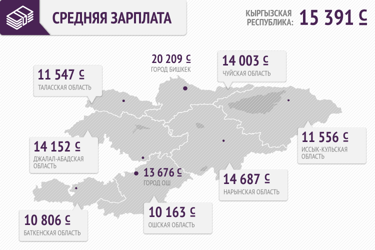 Среднемесячная зарплата по стране — 15,3 тысячи сомов. Конечно, доходы столичных жителей гораздо выше — 20,2 тысячи сомов. Лидером по регионам является Нарынская область с месячной зарплатой в 14,6 тысячи сомов. Меньше всего получают жители Ошской области — 10,1 тысячи сомов.