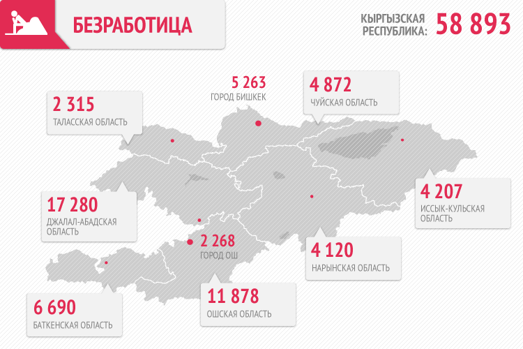 Больше всего зарегистрированных безработных на юге республики. В Джалал-Абадской области насчитывается 17,2 тысячи человек, в Ошской — 11,8 тысячи.