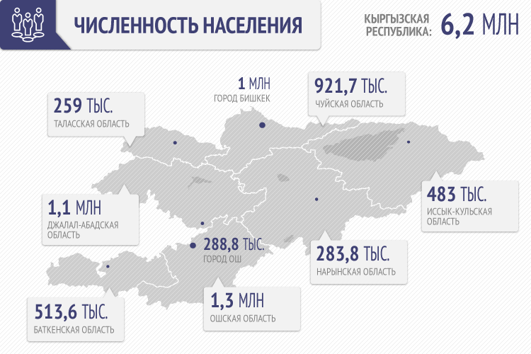 По предварительным данным, численность постоянного населения республики в 2017 году увеличилась на 116,5 тысячи человек. На 1 января 2018-го в Кыргызстане постоянно проживало 6 миллионов 257 тысячи человек.