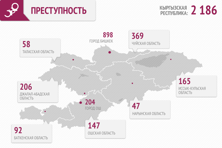 Больше всего преступлений совершено в Бишкеке — 898, Чуйской области — 369, Джалал-Абадской области — 206. Самой спокойной можно считать Нарынскую область, где за месяц произошло только 47 преступлений.
