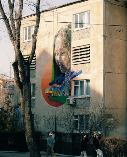 - Ala-Archa River near Asia Mall shopping center: portrait of Ulan Dzhaparov, a pioneer and driver of modern art in Kyrgyzstan;
