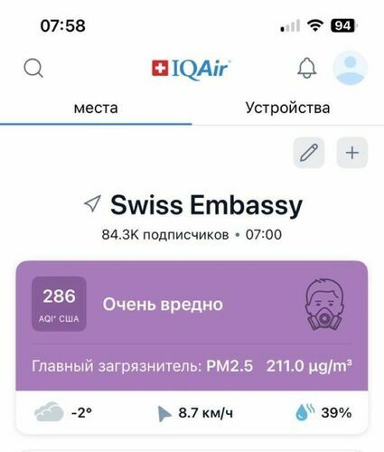 The city’s status is listed as «very unhealthy.» According to the website, the air quality index (AQI) is 214. At the intersection of Moskovskaya Street and Erkindik Boulevard, it rose to 286.