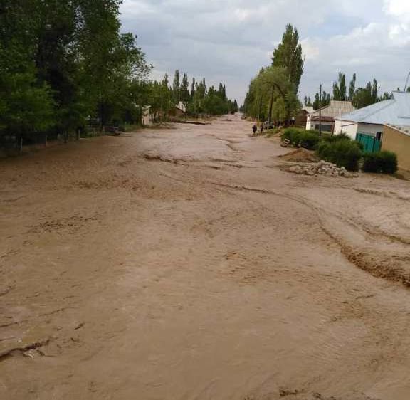 Water from mudflow protecting canal partially flooded the yards, sheds, five hectares of arable land and the school yard in Ak-Zhar village of Kara-Buura district, Talas region, due to heavy rains. The water did not reach the houses, the press service of the Ministry of Emergency Situations reported.