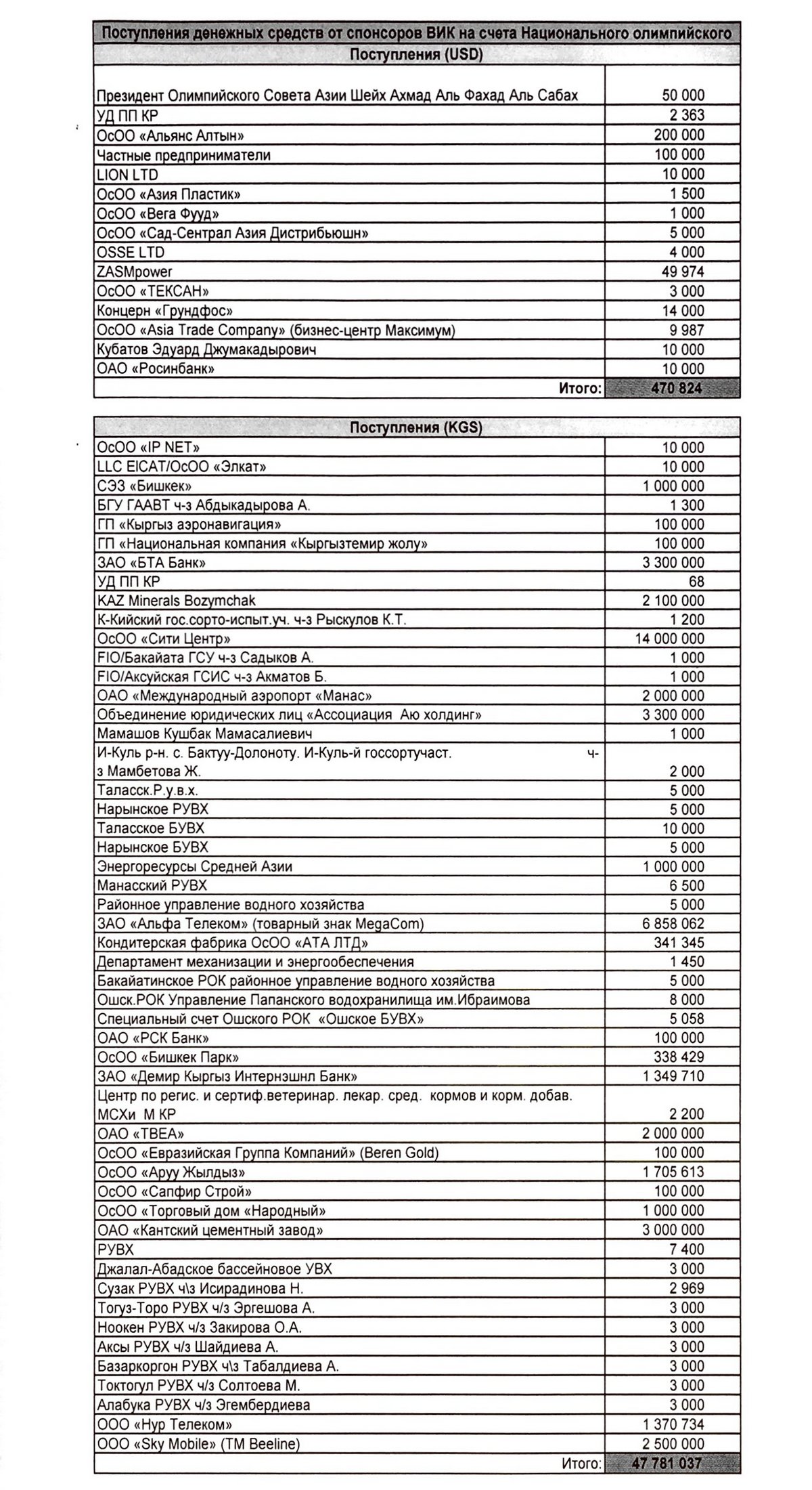 Из спонсорских средств большего всего выделили ОсОО «Альянс алтын» ($200 тысяч), частные предприниматели ($100 тысяч) и ОсОО «Сити-центр» (14 миллионов сомов).