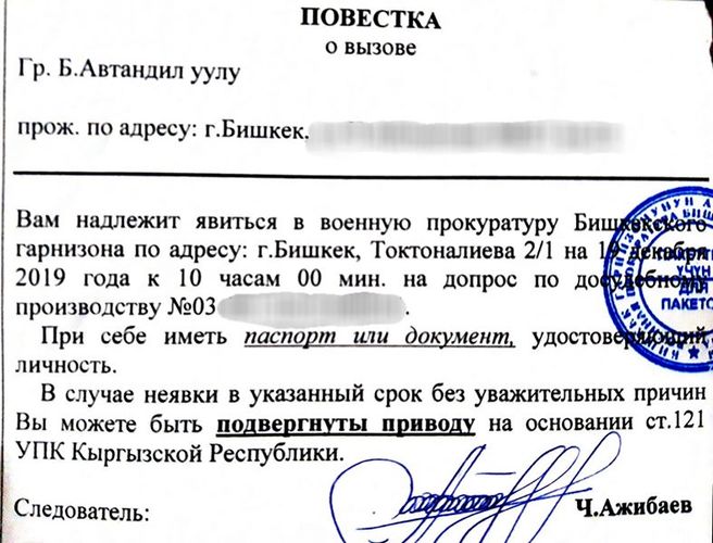 Юрист документте бузуулар бар экенин айтты. Пикиринде, кайсыл тергөөчүгө жана ким катары суракка чакырылганы баса көрсөтүлгөн эмес.