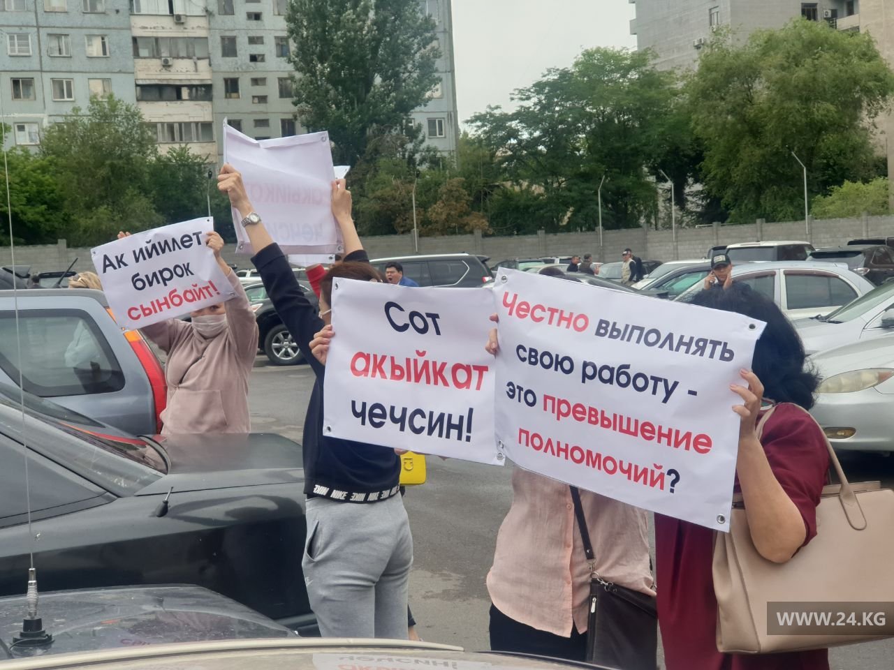 Митингге жалпы 20га жакын адам келип, Мира Карыбаевны тарых музейин оңдоо боюнча кылмыш ишинен акталып чыгуусун суранышууда.