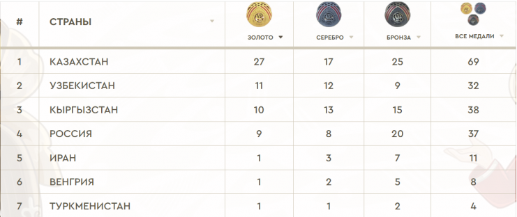 Көчмөндөр оюндарынын эсеп куржунун башында 69 медаль менен Казакстан, экинчи орунда Өзбекстан келатат