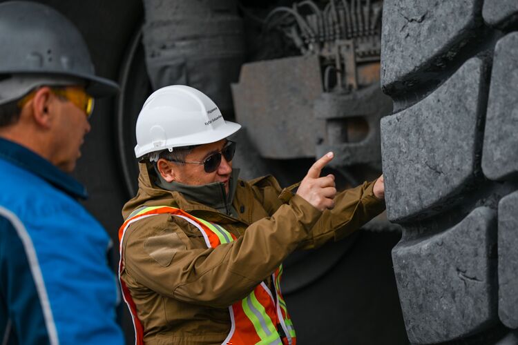«Кыргызалтын» ачык акционердик коомунун башкармалыгынын төрагасы Кубат Абдраимов Кумтөр кенинде оор жүк ташуучу унаалар үчүн чоң габариттүү дөңгөлөктөрдү сыноонун жүрүшү менен таанышты.