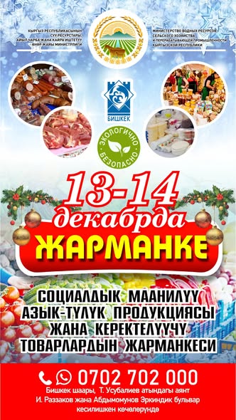 13-14-декабрда Бишкек шаарында социалдык маанилүү азык-түлүк товарларын сунуштаган жергиликтүү өндүрүүчүлөрдүн, дыйкандардын жарманкеси өткөрүлөт. Бул тууралуу Суу ресурстары, айыл чарба жана кайра иштетүү өнөр жайы министрлигинен билдиришти.