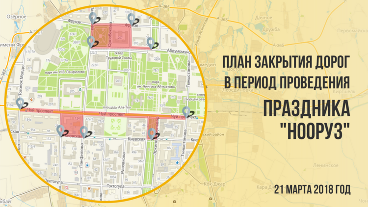 Чүй проспектинин Тыныстанов көчөсүнөн Тоголок Молдо көчөсүнө чейинки бөлүгү, Эркиндик бульварынын Панфилов, Орозбеков, Разаков көчөлөрүнүн Чүй проспектинен Киев көчөсүнө чейинки бөлүгү жабылат. Ошондой эле Абдумомунов көчөсү Эркиндик бульварынан тартып Панфилов көчөсүнө чейин, Панфилов, Орозбеков, Раззаков көчөлөрү Абдумомунов көчөлөрүнөн тартып, Фрунзе көчөсүнө чейин жабылат.