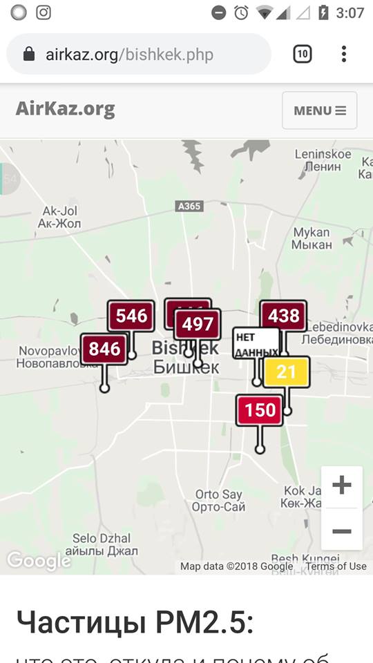 «Ночью наблюдала, картина по городу разная. Один датчик, к примеру, находится в районе парка Панфилова, там отмечено превышение, как и на пересечении улиц Киевской и Тыныстанова. Наиболее высокие разовые превышения нормы отмечаются не в центре столицы, а больше в новостройках. В «Ак-Орго» сегодня в 03.00 датчик показал 846. В Казахстане, Беларуси и России максимально допустимые разовые лимиты варьируются от 150 до 300. А у нас доходит до 860! Самый чистый микрорайон, по нашим данным, — № 7», — сказала Мария Колесникова.
