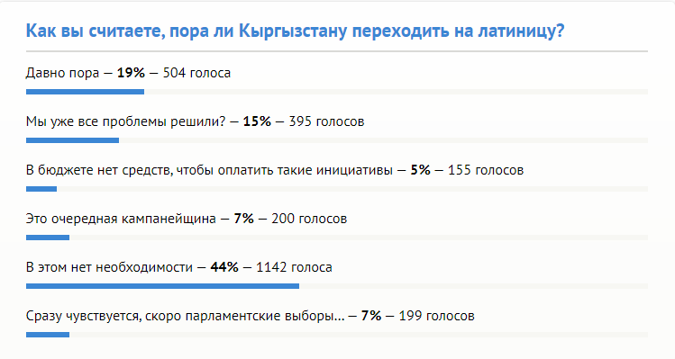 Еще 395 человек поинтересовались, неужели в стране решили все проблемы, что перешли к этому вопросу. Кампанейщиной посчитали предложение депутатов 200 человек. А еще 155 читателей нашего сайта считают, что на переход на латиницу в Кыргызстане просто нет средств. Кроме того, 199 голосов отдано за вариант, что идея с латиницей пришла в умы депутатов из-за предстоящих парламентских выборов.