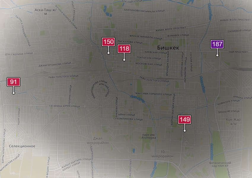 • жилмассив «Ак-Орго». Уровень загрязнения превышен в три раза: PM2.5 среднесуточный — 106 мкг/м³, на момент измерения — 91 мкг/м³.