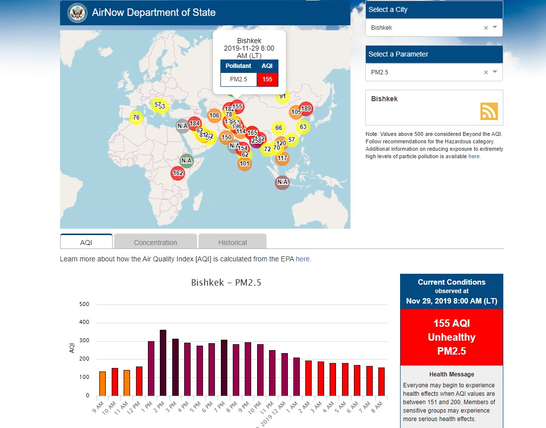 Посольство США в Кыргызстане также установило датчик. Он показывает индекс качества воздуха в режиме онлайн. Информация обновляется ежечасно.
