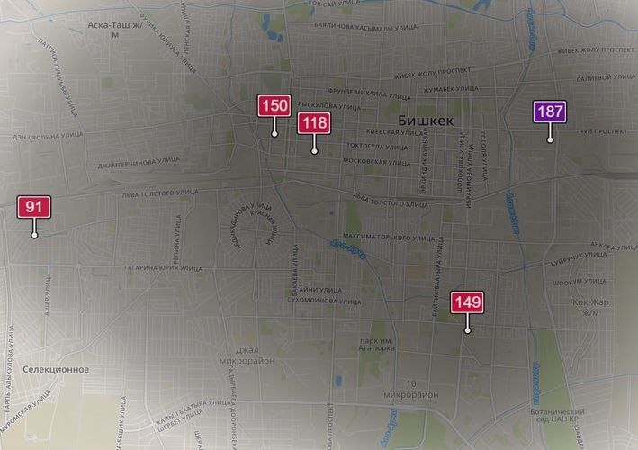 • в районе улиц Бейшеналиевой/Токтогула. Уровень загрязнения превышен в 12,4 раза: PM2.5 среднесуточный — 435 мкг/м³, на момент измерения — 150 мкг/м³;
