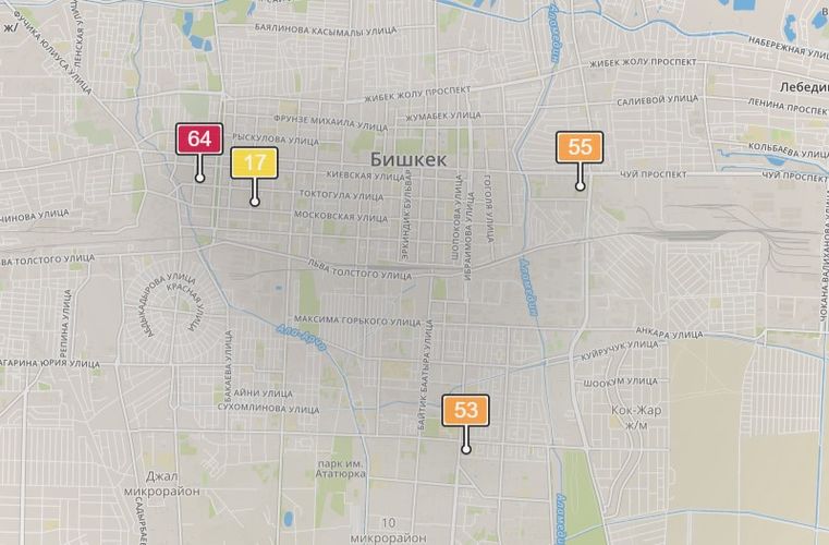 • в районе улиц Бейшеналиевой/Токтогула. Уровень загрязнения превышен в 5,77 раза: PM2.5 среднесуточный — 202 мкг/м³, на момент измерения — 64 мкг/м³;