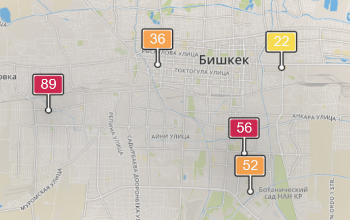 • в районе улиц Бейшеналиевой/Токтогула. Уровень загрязнения превышен в 2,22 раза: PM2.5 среднесуточный — 78 мкг/м³, на момент измерения — 36 мкг/м³;
